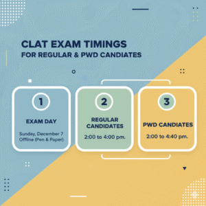 The CLAT 2026 exam will be held on Sunday, from 2:00 P.M. to 4:00 P.M. for the Regular candidates or General category. Eligible candidates in the PWD (Persons with Disabilities) category will have a longer time slot, from 2:00 to 4:40 p.m. They will get an extra 40 minutes. The exam will take place offline, using pen and paper.